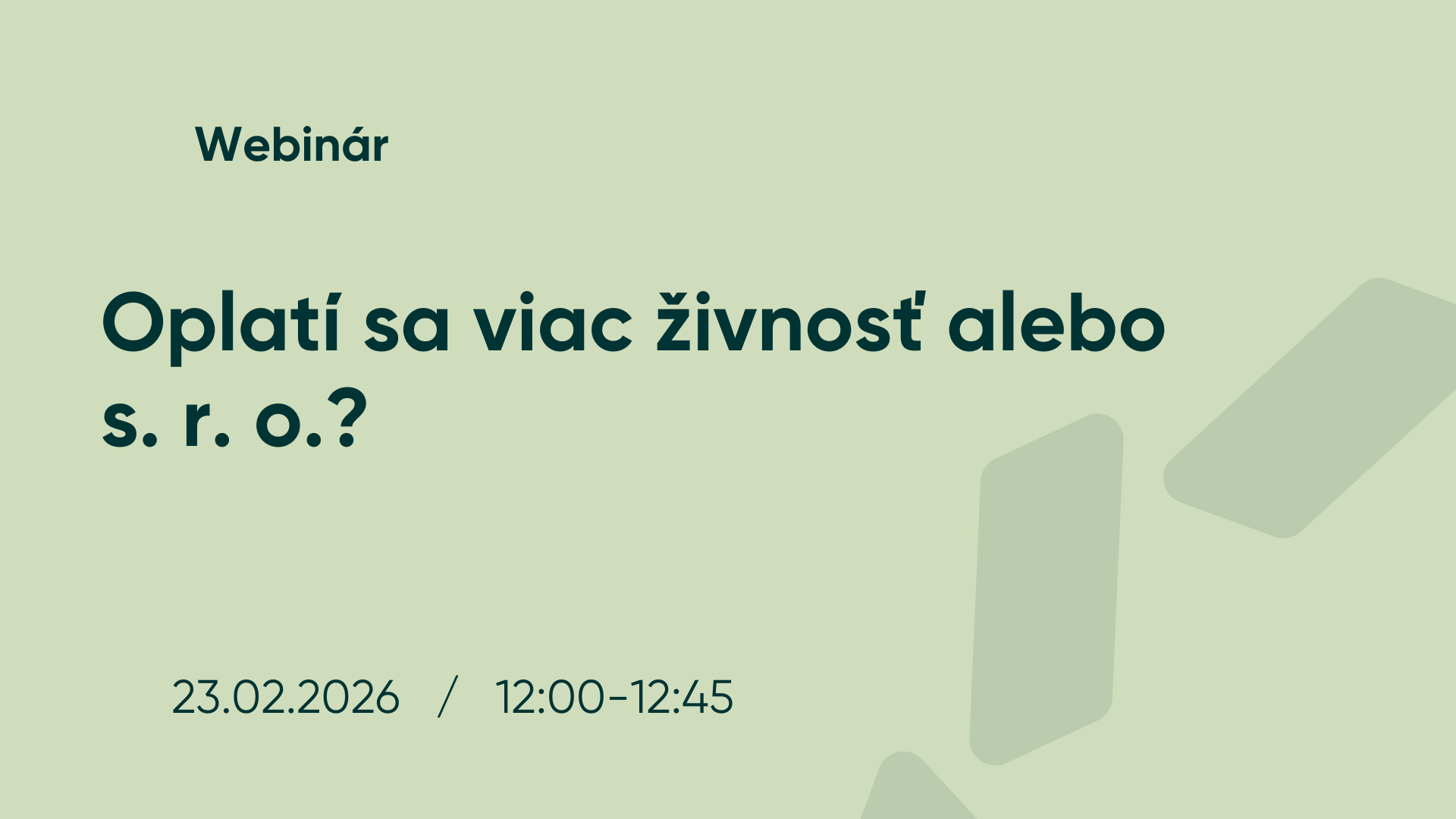 Pri raste príjmov začínajú podnikatelia prirodzene riešiť, či je ich aktuálna forma podnikania stále najvýhodnejšia. Tento pokročilý webinár je určený pre tých, ktorí už poznajú základné rozdiely medzi živnosťou a s. r. o., no chcú ísť viac do hĺbky, pracovať s konkrétnymi číslami a pochopiť, ako sa rozhodnutie prejaví v praxi na daniach, odvodoch aj čistom príjme.